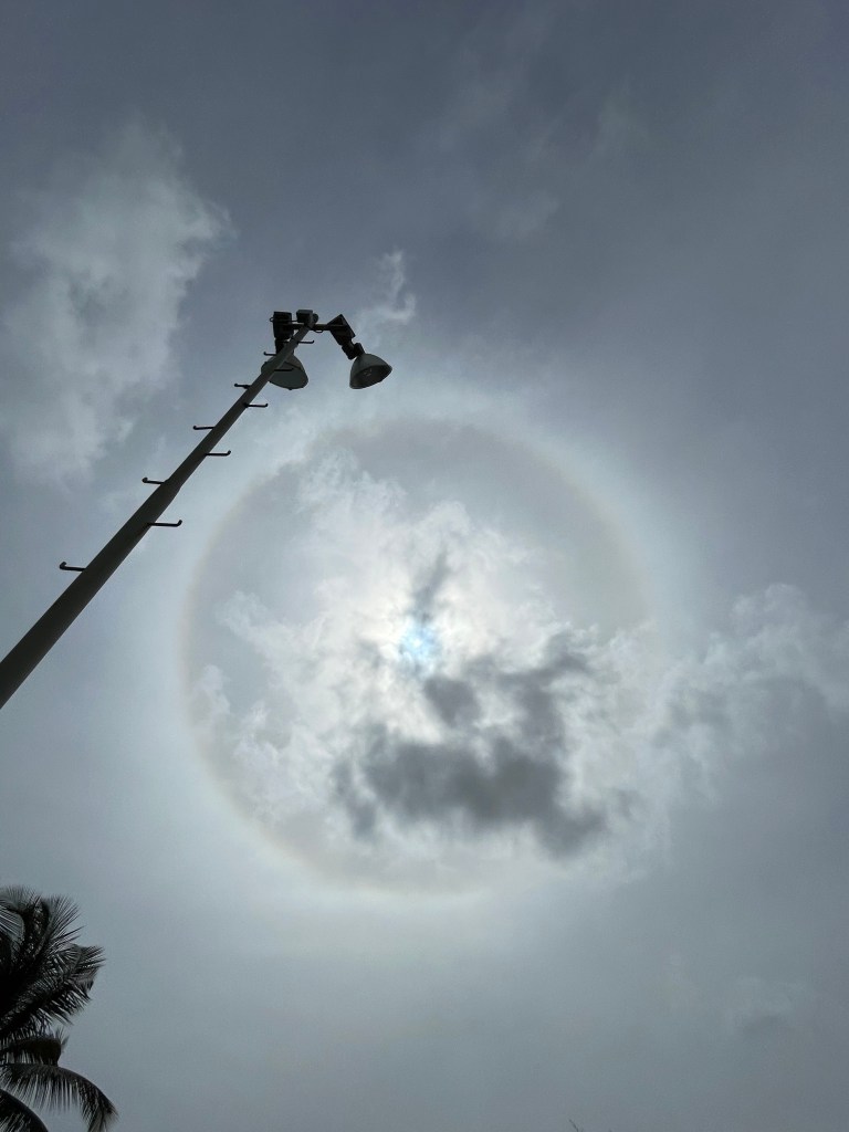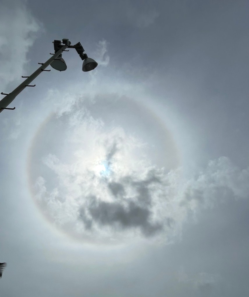 A halo is a ring or light that forms around the sun or moon as either one of them, refracts off ice crystals present in a thin veil of cirrus clouds, so it’s usually seen as a bright , white ring although it may have another kind of colors. I understand that I have taken different moon halo pictures, but a solar, let’s say is my first time.